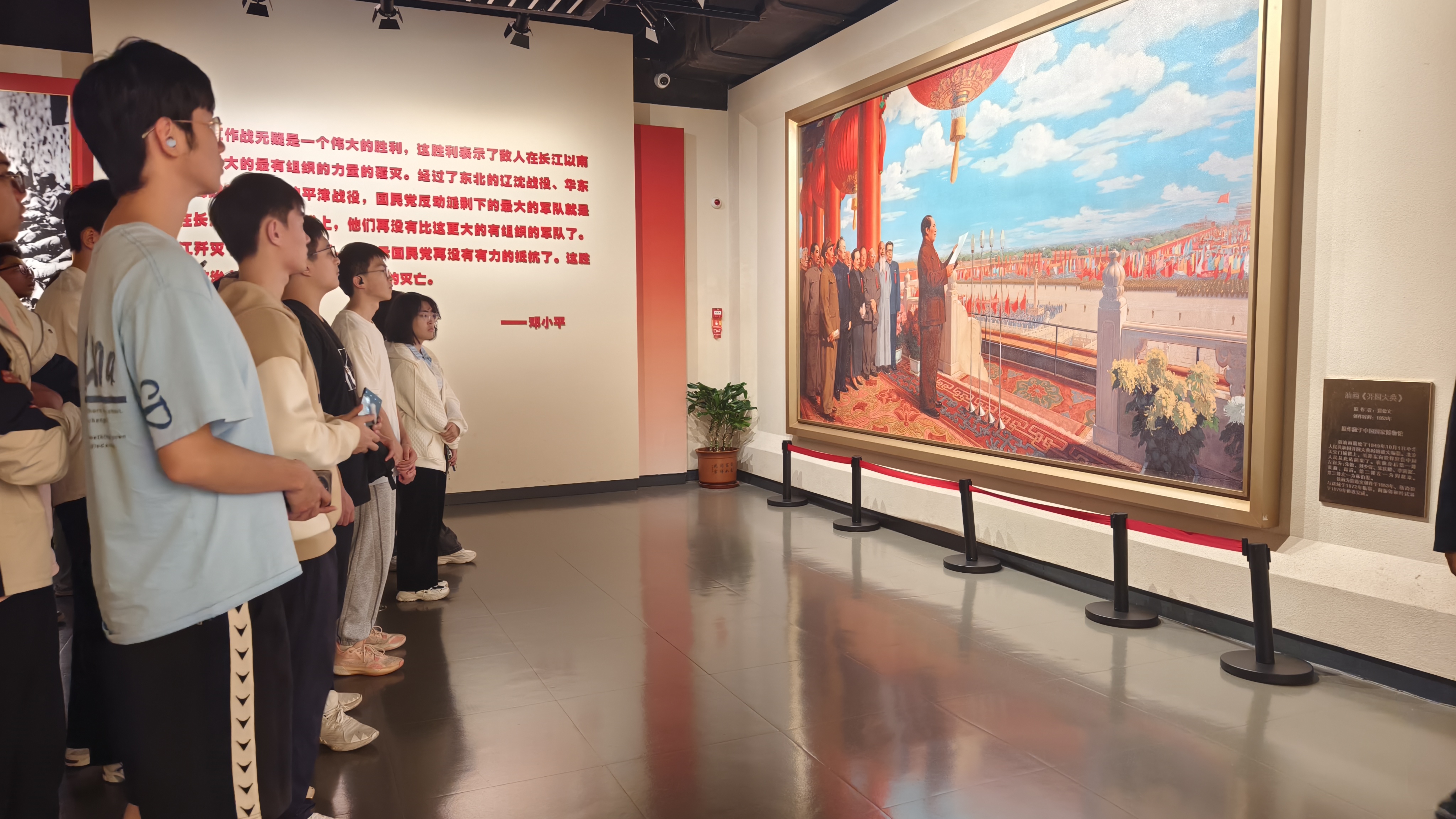讲解员带领大家来到展示油画《开国大典》的区域。在这幅画作前,讲解员讲述着渡江战役胜利为新中国成立奠定的坚实基础。同学们整齐站立,目光专注的凝视着油画,仔细聆听讲解,深刻领会这一伟大历史背后的艰辛奋斗与辉煌成就。