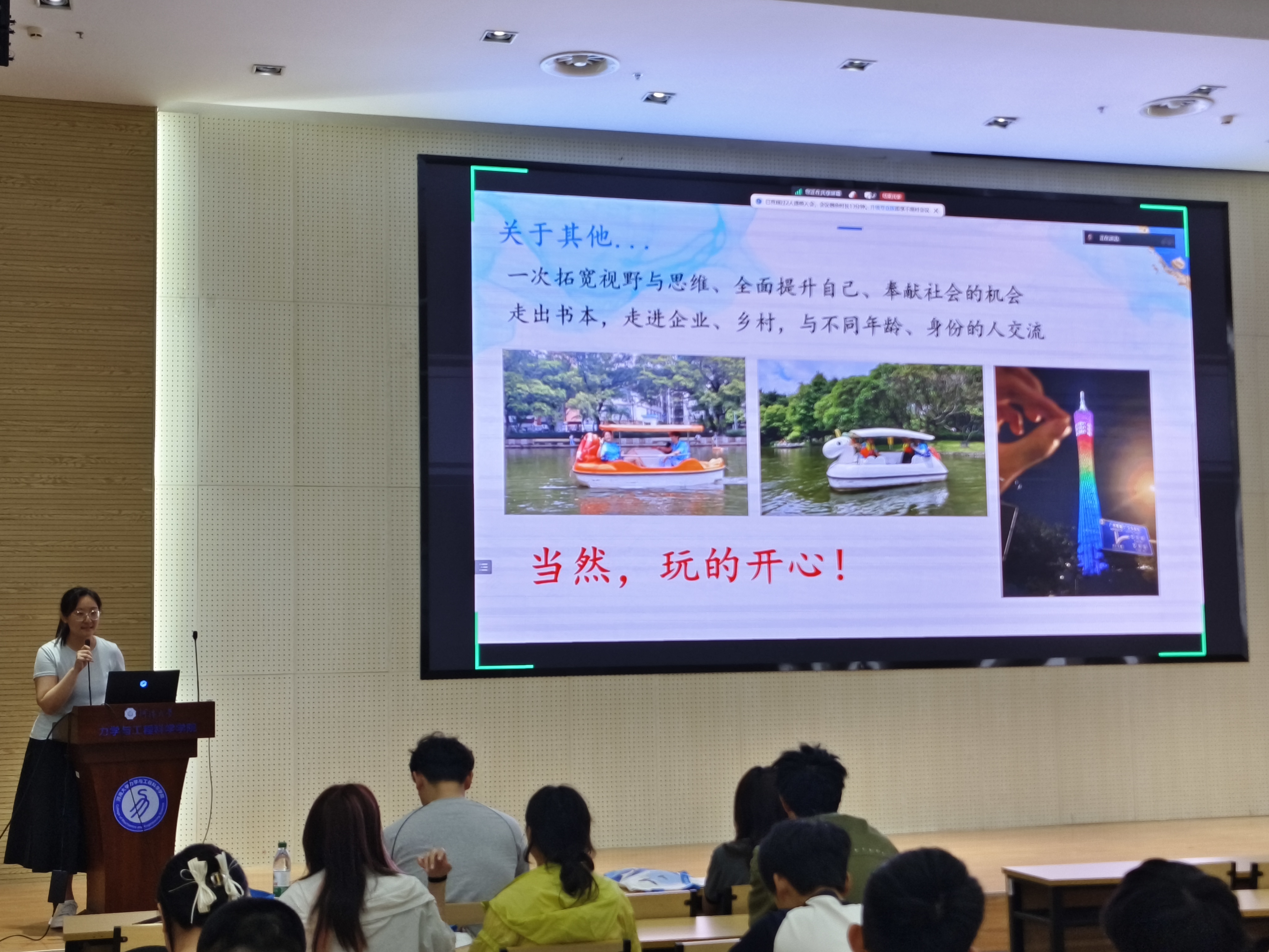 分享会邀请省级优秀团队《珠三角州岸线保护实践团》的负责人港航院2023级本科生赵安欣同学、省级优秀团队《“彝海盟约,长征新途”红色文明调研团》的负责人农工院2022级本科生何昊骏同学、省级优秀团队《“乡村振兴,寻迹金寨”发展成就观察团》的负责人公管院2021级本科生王雨婷同学、校级优秀团队《“天堑变通途”中铁大桥局就业实践团》的成员PlayAce2023级本科生黄嘉滨同学进行经验分享,公司团委书记陈爽和两百多名员工参加。