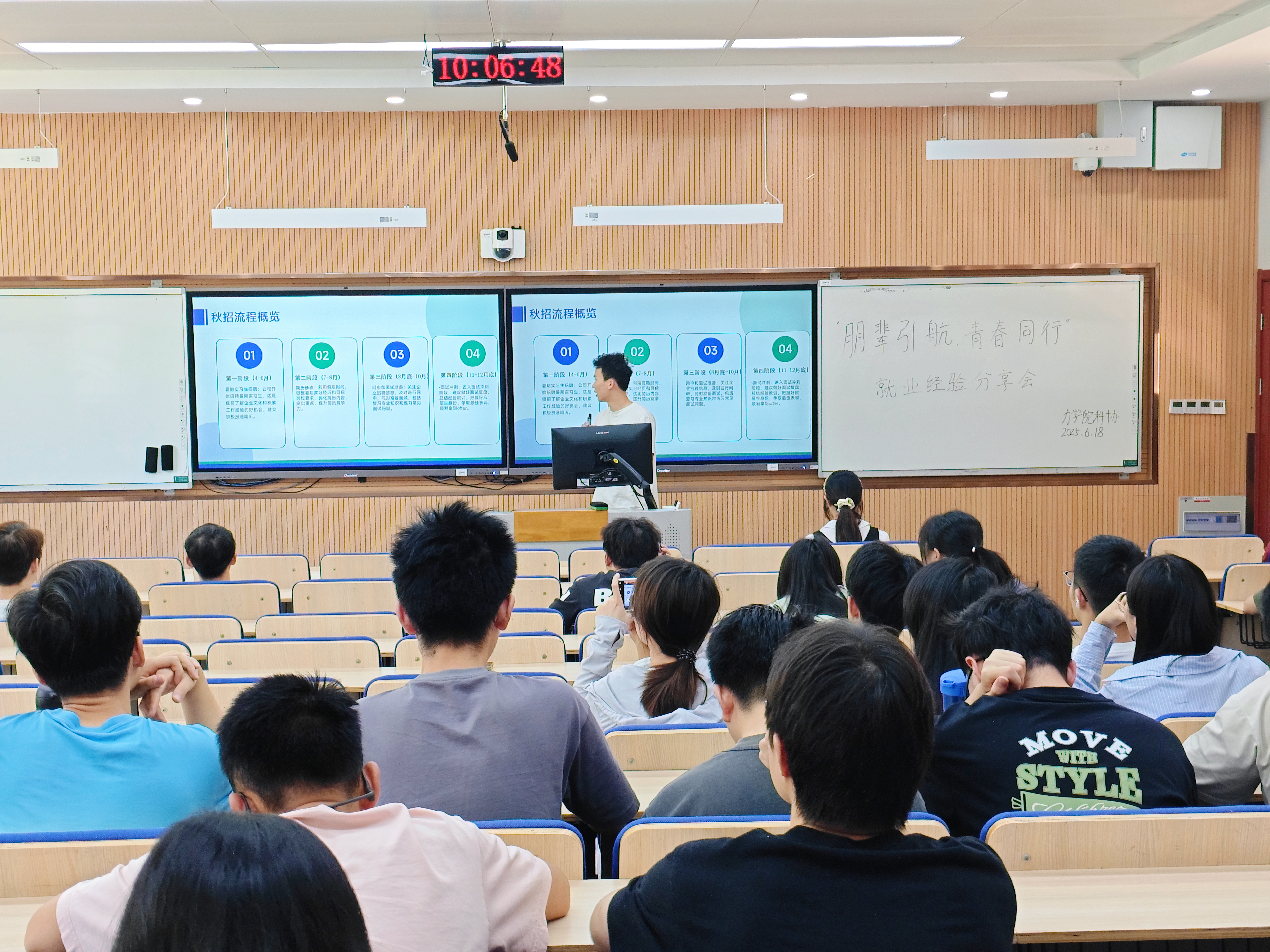 为深入学习贯彻习近平总书记关于青年工作的重要思想,落实“共青团促进老员工就业行动”,引导老员工立足实际、找准定位,树立理性、平实的择业观、就业观,提升积极的就业意识,助力毕业生高质量就业,公司团委于6月19日在江宁校区致用楼120教室举办了“朋辈引航,青春同行”就业经验分享会暨“老员工就业引航”主题团日活动,邀请了2022级硕士研究生徐焱明、范思圆和2021级工程力学本科生唐新、汪波波4位优秀毕业生与同学们面对面开展经验交流。2026届本科生、研究生参与本次活动。